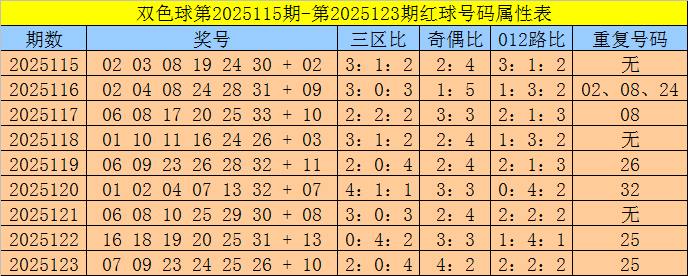 福彩双色球第2025123期奖号为:07 09 23 24 25 26 + 10,红球奇偶比为4:2,三区比为2:0:4,012路比为2:2:2,重号:25。