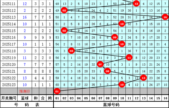 蓝球号码:最近9期分别开出蓝球号码02、09、10、03、11、07、08、13、10,蓝球号码012路个数比为2:4:3,其中0路蓝球开出最少,本期可以放弃,参考蓝球01、10、13、16。