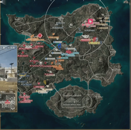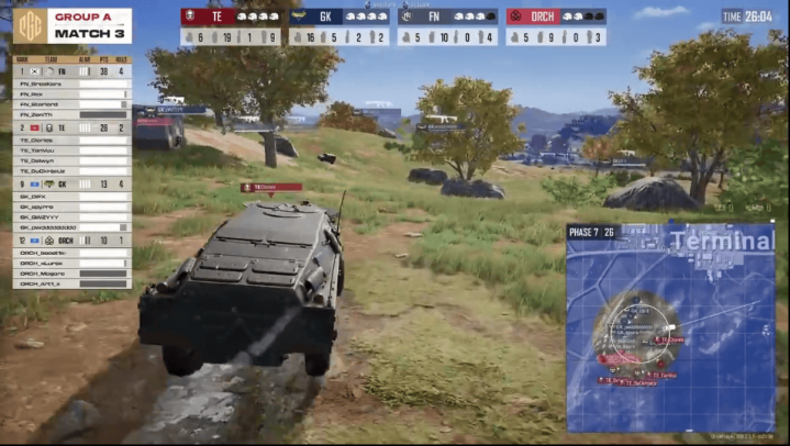 决赛圈,圈型刷在菜市场南部。ORCH利用道具将FN两人淘汰,TE占据高点优势打掉GK一人,随后ORCH独狼也被GK打掉,TE轻松吃鸡。