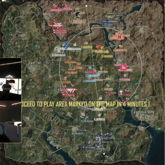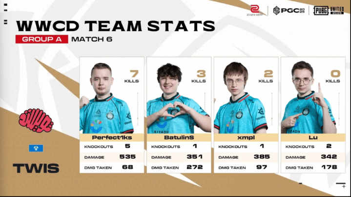 决赛圈,QAD独狼先被被蓝圈带走,随后TWIS利用人数优势持续推进将NMG与ORCH两队淘汰,TWIS成功吃鸡。
