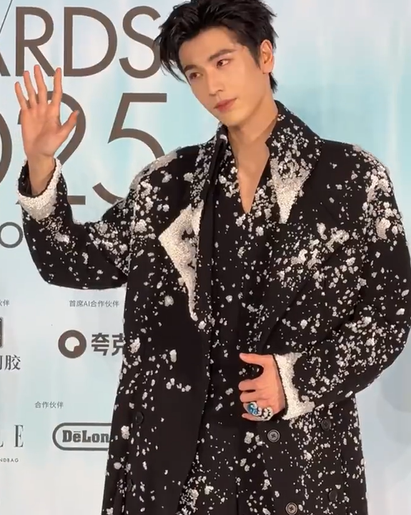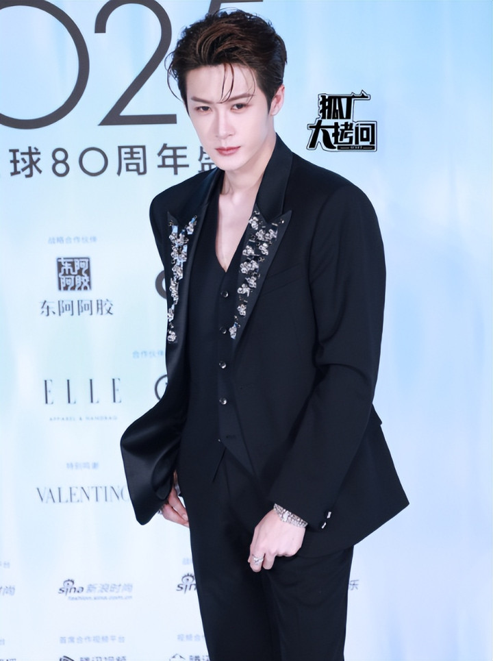 这次他身穿黑色西装亮相,丝绒材质显得格外有质感,极简设计突出肩部廓形与腰线,领口上的钻石设计更添贵气,有种低调的奢华感,“贵公子”的气场拉满了。