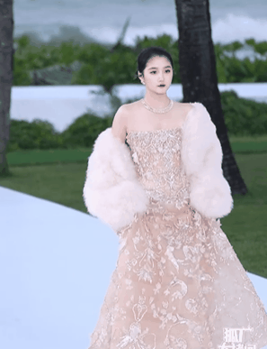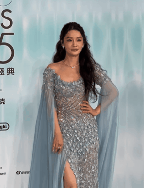 此次她身穿一袭浅蓝色高开叉纱裙,裙身缀满碎钻和花朵刺绣,手臂上长到拖地的蓝纱看得人眼前一黑,整体颇为杂乱,还透着一股廉价感,像是十几年前的老款,扑面而来一股影楼风,拉低了整体的质感。