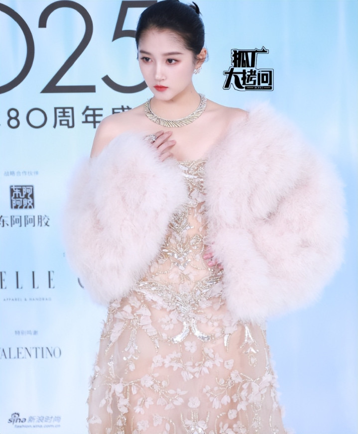 原本她的骨架就比较大,这次身穿的香槟色蕾丝长裙,裙身还缀满了立体花朵刺绣与珠饰,元素太繁杂了,搭配嫩粉色皮草披肩,更显得她肩宽背厚,远远走来时,给人的感觉又“壮”了不少。