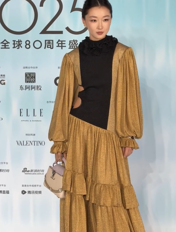 一身黑金拼接的长裙,兼具贵气与先锋感,既不用力过猛,也不会泯然众人,非常适配周冬雨的气质。