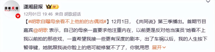 原来胡妈妈从一开始就看不上他拍的古偶戏,胡歌妈妈觉得那些打来打去的戏没什么意思,非要他接有深度的本子。